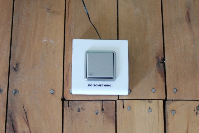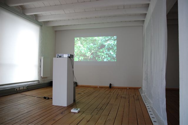 A one-shot video of a (seemingly) untouched, peaceful landscape is shown, nothing special happens. When the visitor of the installation enters the room and causes noise, this noise will be added to a pool, which absolute value is causing video interferences. The higher this value gets, the more the original video becomes a collage of noise, coloured planes, wildly moving in any direction, at a certain point not anymore distinguishable as the peaceful landscape it used to be. Additionally, the Reckoning of this state might cause an awkward viewing situation. The visitor now has the option to hit a button which is lying on the floor, with a note saying "do something". As soon as the visitor hits the button, the original setting will be restored to its original state, but with the exception that the saturation of the original setting is reduced, the video playback, including the audio, is slowed down. This circuit of interaction continues - until there remains nothing more than a black and white still picture - a memory of what once was. Patience then is the only way that the original state can be restored.