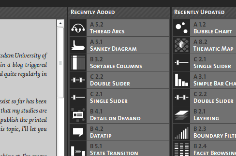 Digital Media Bremen and Interface Design Potsdam graduate Christian Behrens recently finished his Master thesis at the University of applied sciences in Potsdam. He designed a compendium of dozens of information design patterns, such as treemaps, pie charts, thread arcs, etc. There is an online version available as well as a printed book (which is not yet for sale).