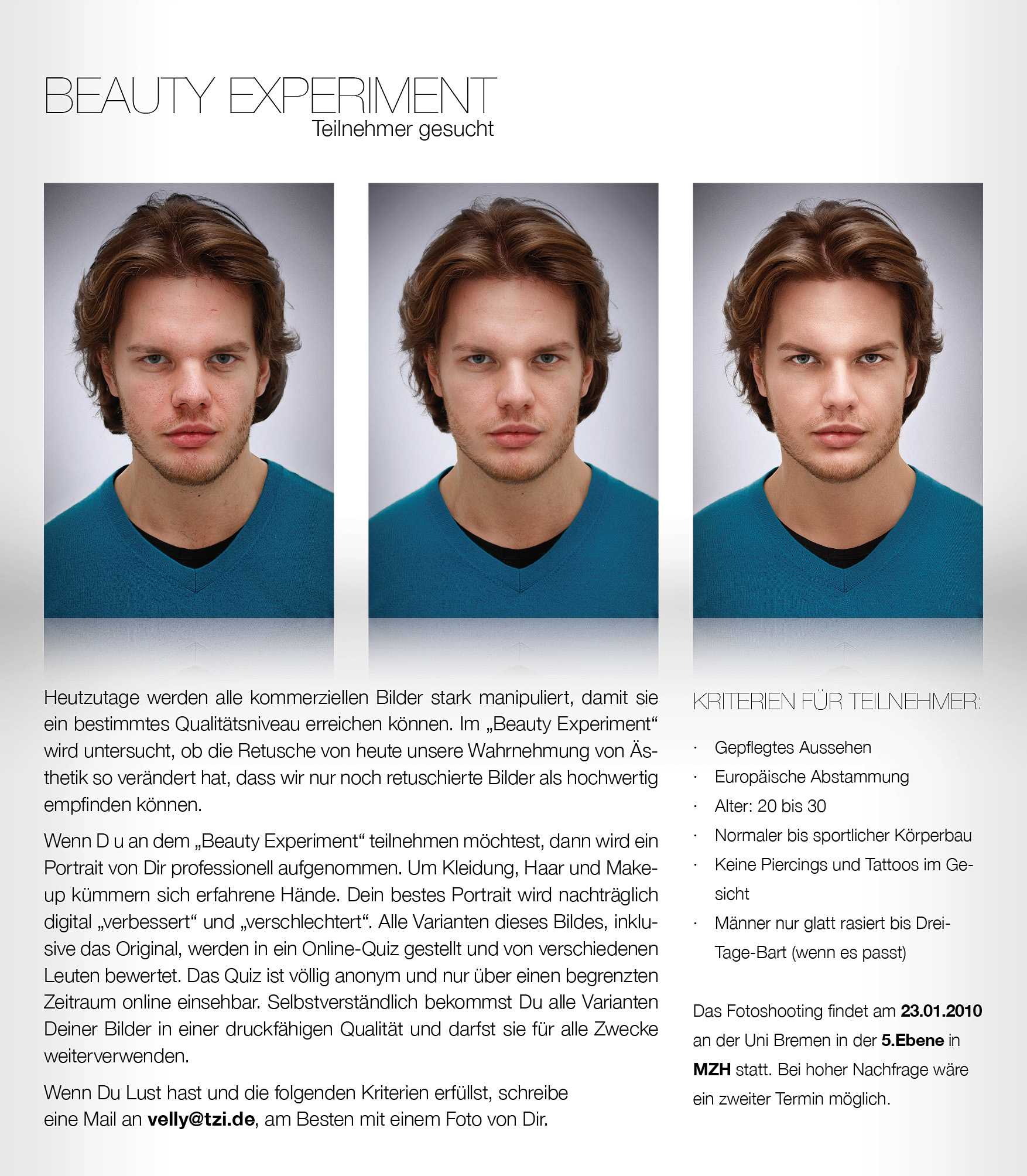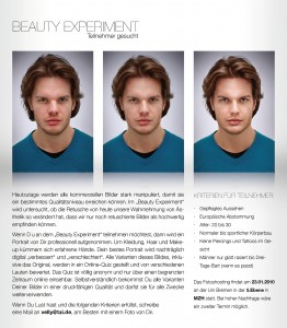 Nowadays all commercial images are heavily manipulated to achieve a certain level of quality. The "Beauty experiment" investigates the effect of retouching on our perception of aesthetics. If you participate in the "Beauty experiment", a portrait of you will be professionally shooten, including make-up, hairstyling and clothing. Your best portrait will be digitally improven as well as deteriorated subsequently. All variants of this portraits, inclusive the original will be placed in an online quiz and evaluated by different people. The quiz is completely anonymous and will be online over a short period of time. You get all variations of your images in a printable quality for free afterwards. If you're interested and fulfill the following criteria, write an email to velly@tzi.de, preferably with a photo of you.